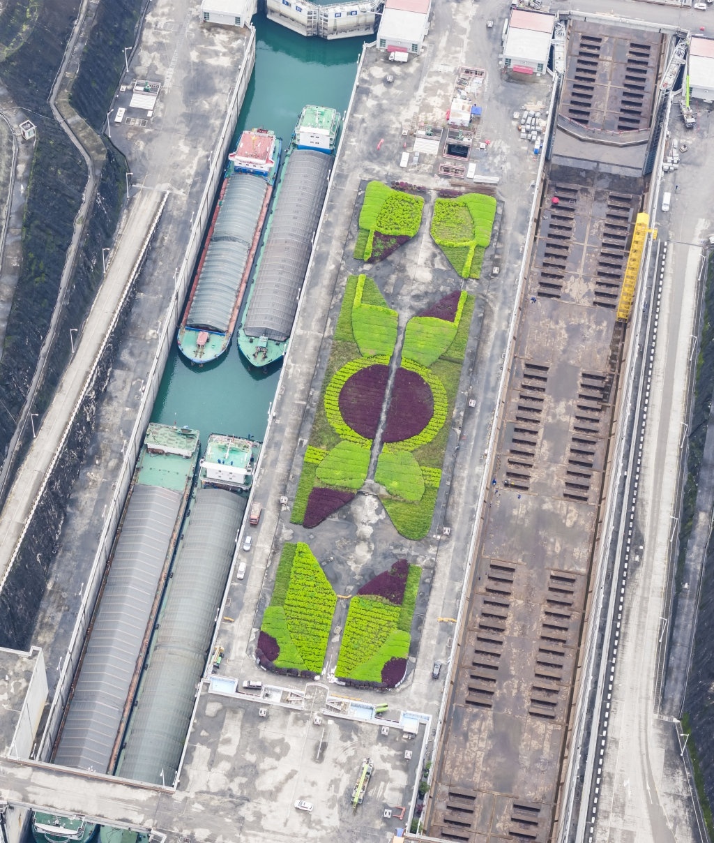 3月30日,湖北宜昌,三峡枢纽南线船闸正加紧检修,北线船闸有序通航(无人机照片)。
