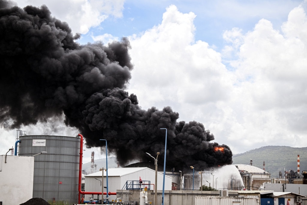 以色列海法炼油厂在导弹袭击中起火。