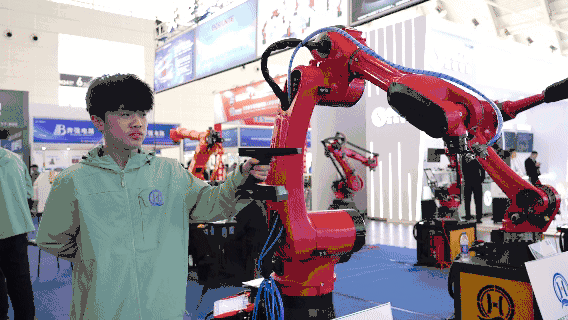中国天津工博会现场,工作人员正在“指挥”一台机器进行操作(央广网发 蔺子贤 摄)