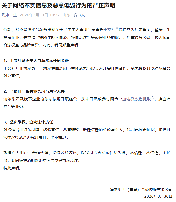3月30日上午,盈康一生微信公众号发布署名海尔集团(青岛)金盈控股有限公司(以下简称海尔金控)的声明。声明称,近期,多个网络平台频繁出现关于“虞美人集团”董事长于文红谎称其为海尔集团、盈康一生投资企业,并捏造“提取年轻人血液、换血治疗”等虚假业务的谣言,严重误导公众、损害了公司合法权益与品牌声誉。