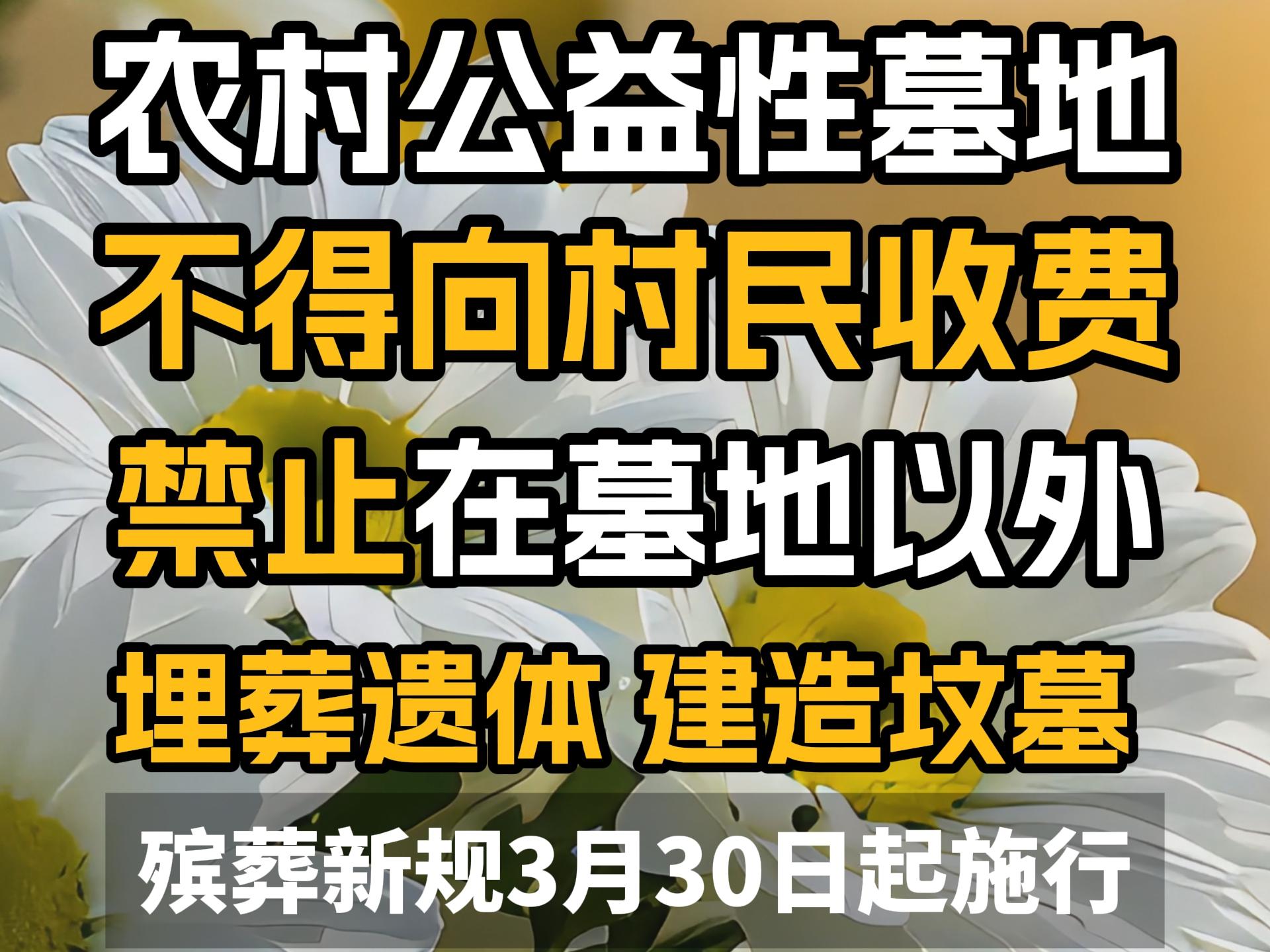2026年3月30日,新修订的《殡葬管理条例》(简称《条例》)开始施行。《条例》进一步强化了殡葬行业的公益属性,明确禁止住宅专门用于安置骨灰等,禁止在公墓、农村公益性墓地以及依法实施生态安葬的区域以外的地方埋葬遗体、建造坟墓。