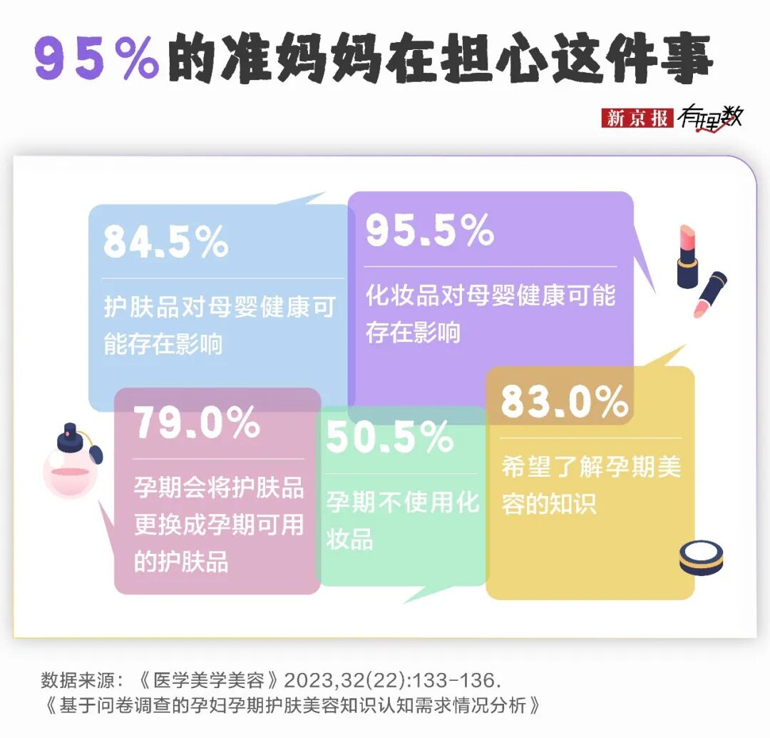 一项问卷调查显示,95.5%的受访孕妇认为化妆品可能影响母婴健康;近八成孕妇在发现怀孕后会更换护肤品;另外还有超过一半的孕妇在孕期选择不使用化妆品。