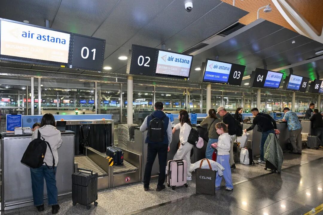 凌晨3点53分许,哈萨克斯坦阿斯塔纳航空“阿拉木图-上海”首航航班平稳降落在上海浦东国际机场,并穿过象征民航最高礼仪的水门。