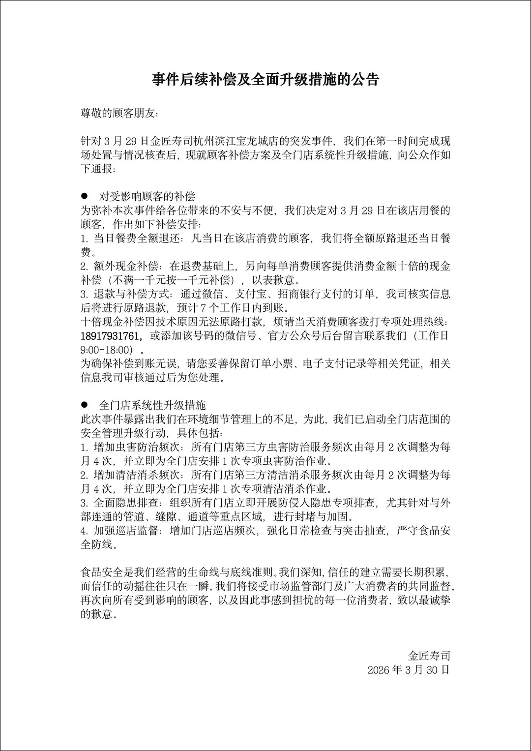 3月30日,金匠寿司官方账号又发布《事件后续赔偿及全面升级措施的公告》: