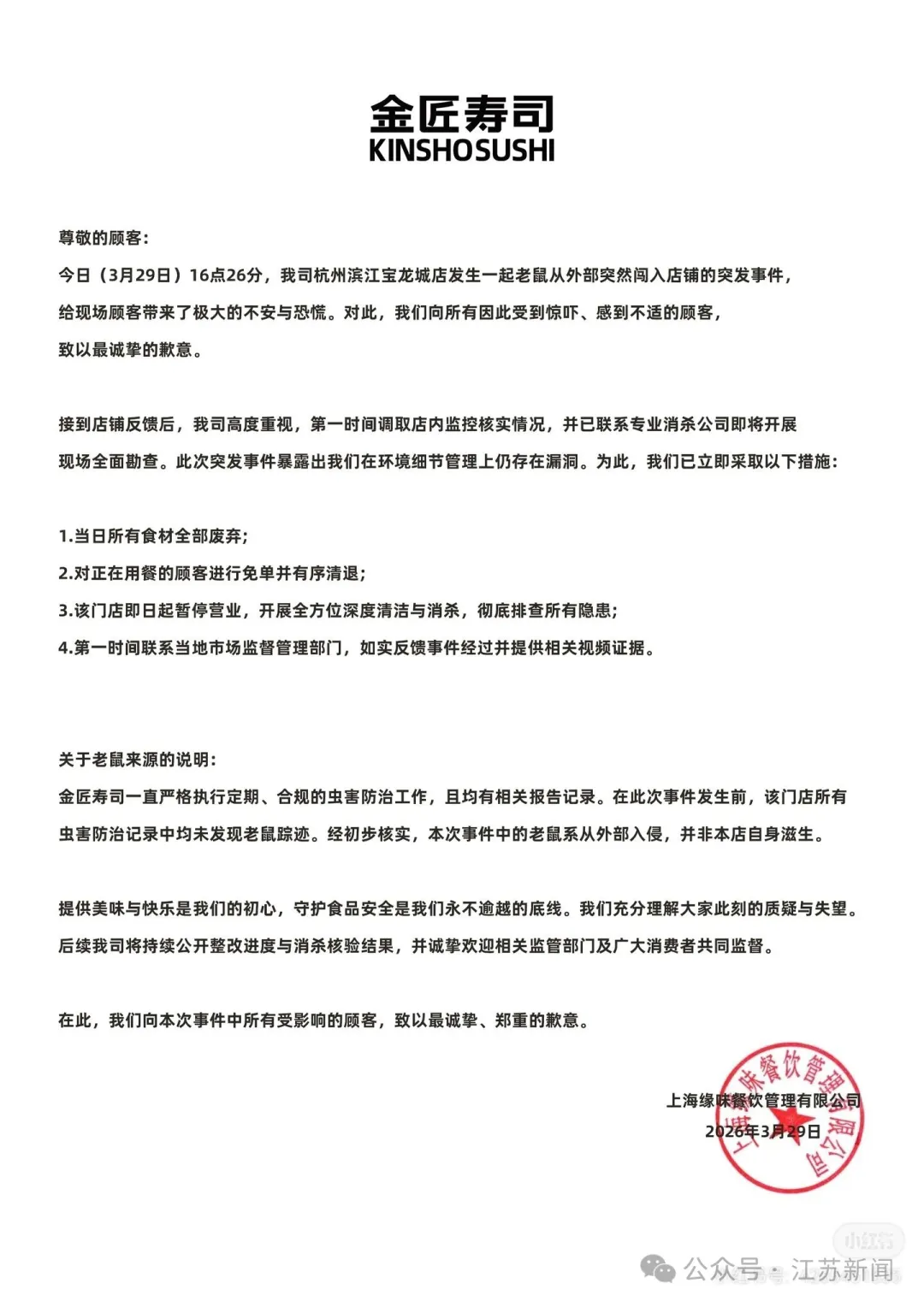 金匠寿司发布致歉声明:3月29日16点26分,杭州滨江宝龙坡店发生一起老鼠从外部突然闯入店铺的突发事件,给现场顾客带来了极大的不安与恐慌。对此,我们向所有因此受到惊吓,感到不适的顾客,致以最诚挚的歉意。