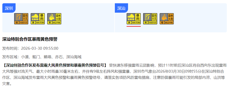 【深汕特别合作区发布雷雨大风黄色预警和暴雨黄色预警信号】 受快速东移强雷雨云团影响,预计11时前后深汕区将自西向东出现雷雨大风等强对流天气,最大小时雨量30毫米左右,并伴有9级左右阵风和强雷暴,深圳市气象台2026年03月30日09时55分在深汕特别合作区、深汕海域发布雷雨大风黄色预警和暴雨黄色预警信号,请落实各项防风防雷电措施,注意防御暴雨可能引发的局部内涝、山洪等灾害