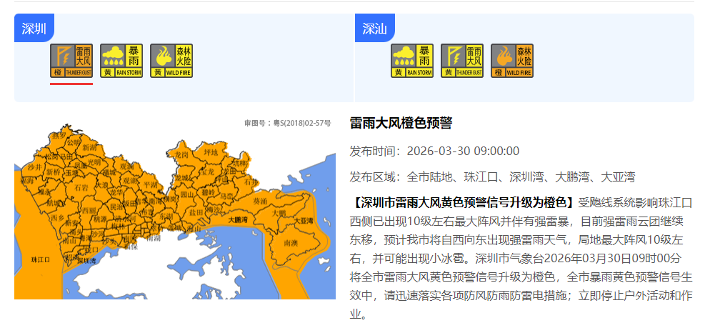 【深圳市雷雨大风黄色预警信号升级为橙色】受飑线系统影响珠江口西侧已出现10级左右最大阵风并伴有强雷暴,目前强雷雨云团继续东移,预计深圳市将自西向东出现强雷雨天气,局地最大阵风10级左右,并可能出现小冰雹。深圳市气象台2026年3月30日9时00分将全市雷雨大风黄色预警信号升级为橙色,全市暴雨黄色预警信号生效中,请迅速落实各项防风防雨防雷电措施;立即停止户外活动和作业。