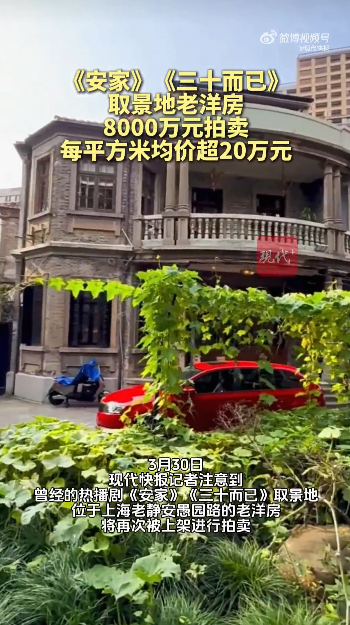 据现代快报消息,3月30日,记者注意到,曾经的热播剧《安家》《三十而已》取景地,位于上海老静安愚园路的老洋房,将再次被上架进行拍卖。这次拍卖已经是它的第五次拍卖,起拍价设置为8000万元,每平方米均价超20万元。