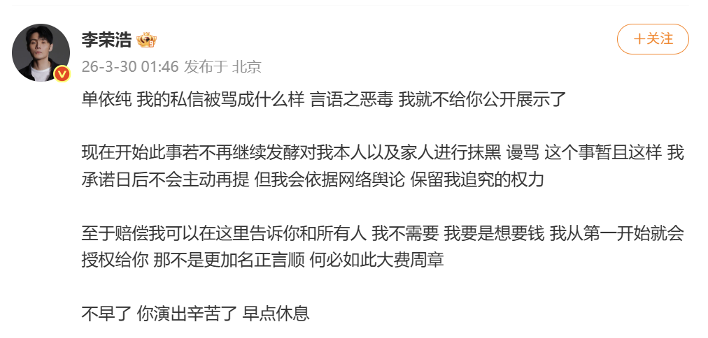 3月30日凌晨,歌手单依纯发长文向李荣浩道歉。