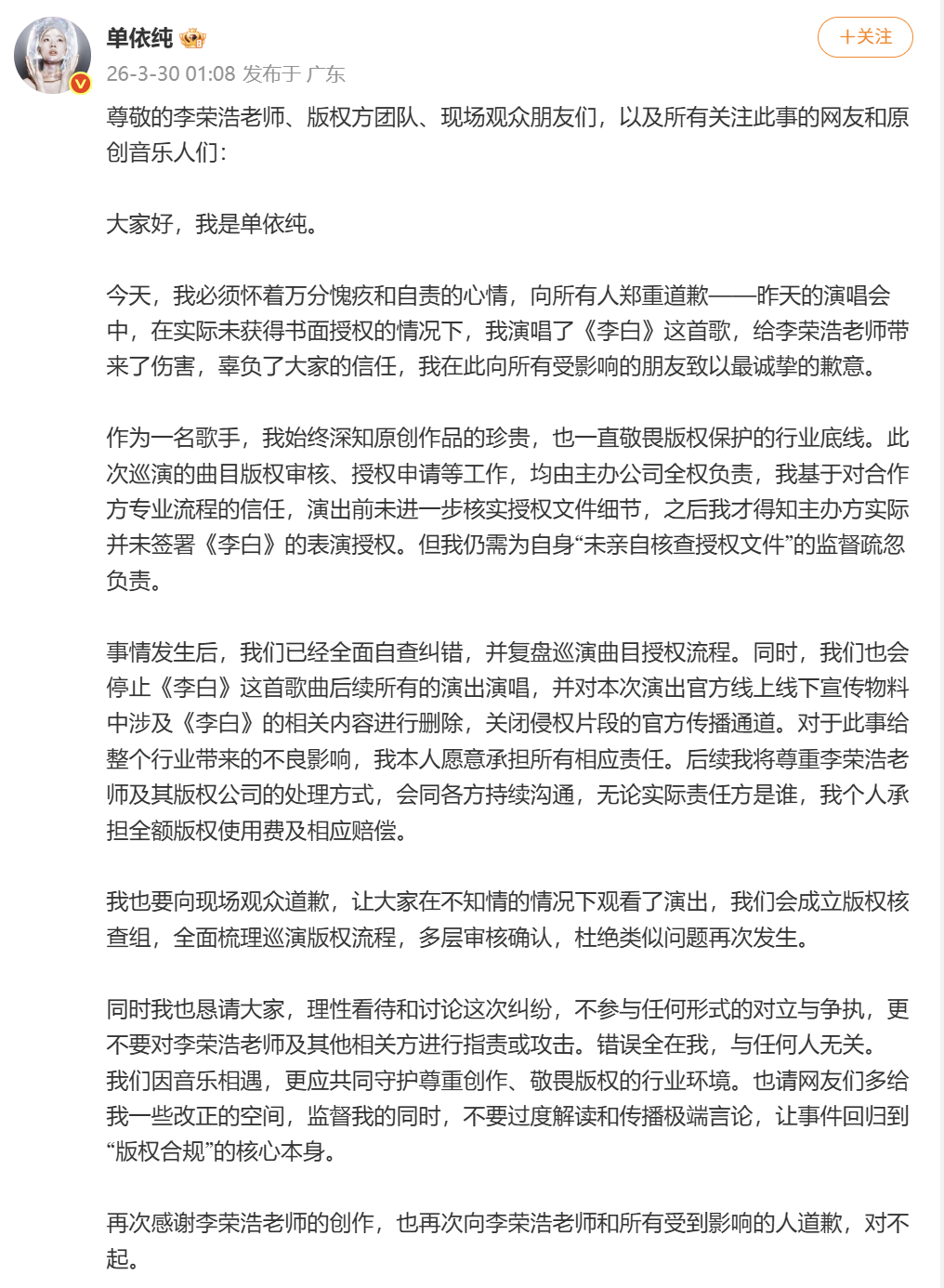 文中称,此次巡演的曲目版权审核、授权申请等工作,均由主办公司全权负责,自己演出前未进一步核实授权文件细节,之后才得知主办方实际并未签署《李白》的表演授权。“但我仍需为‘自身未亲自核查授权文件’的监督疏忽负责。”