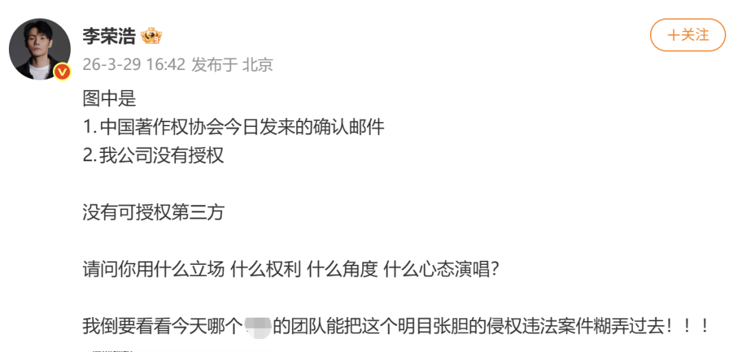 随后,李荣浩再次发文,确认中国著作权协会没有就《李白》发放任何授权。