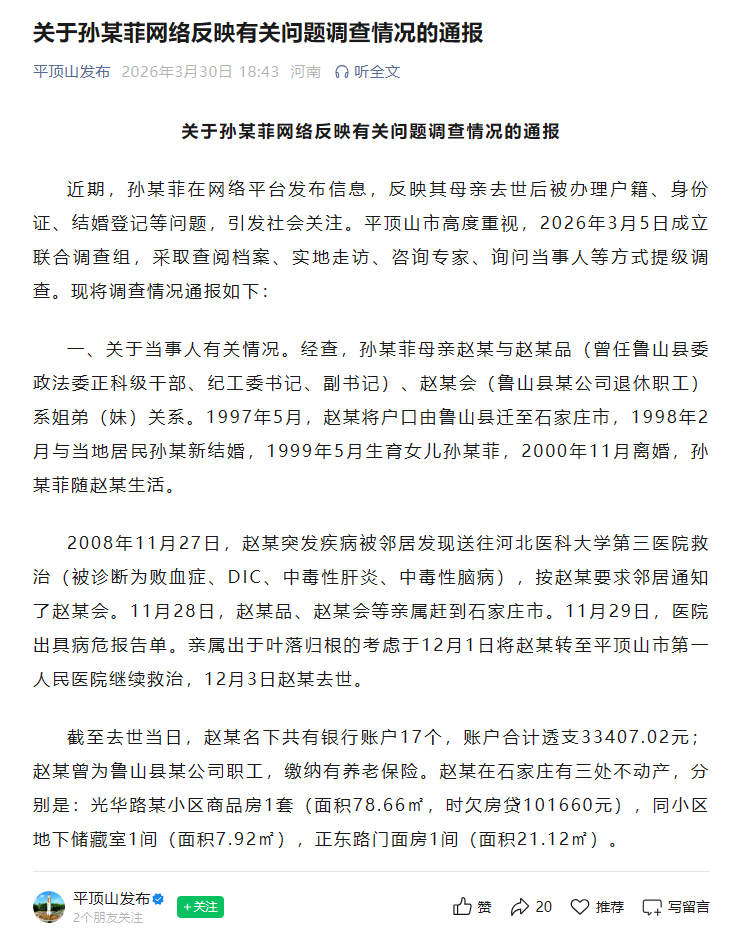 近期,孙某菲在网络平台发布信息,反映其母亲去世后被办理户籍、身份证、结婚登记等问题,引发社会关注。平顶山市高度重视,2026年3月5日成立联合调查组,采取查阅档案、实地走访、咨询专家、询问当事人等方式提级调查。现将调查情况通报如下: