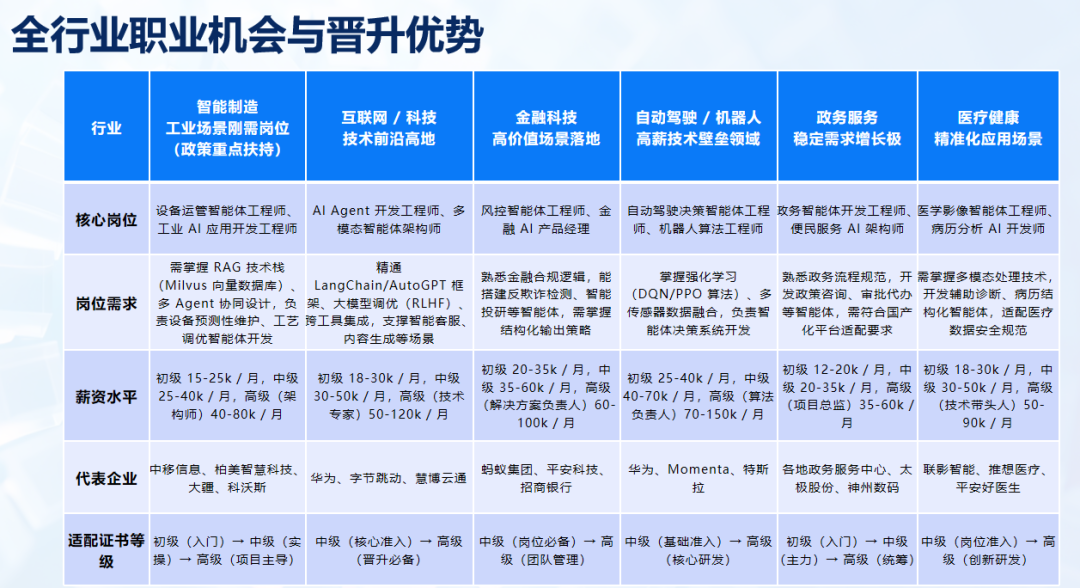 目前,国内正大力提倡深入实施“人工智能+”行动,各类企业AI相关岗位增多,需求增加!无论是AI智能体开发工程师还是行业方案设计师,持证者可适配多领域岗位需求,逐步实现跨行业转型,拓宽自己的职业选择范围!