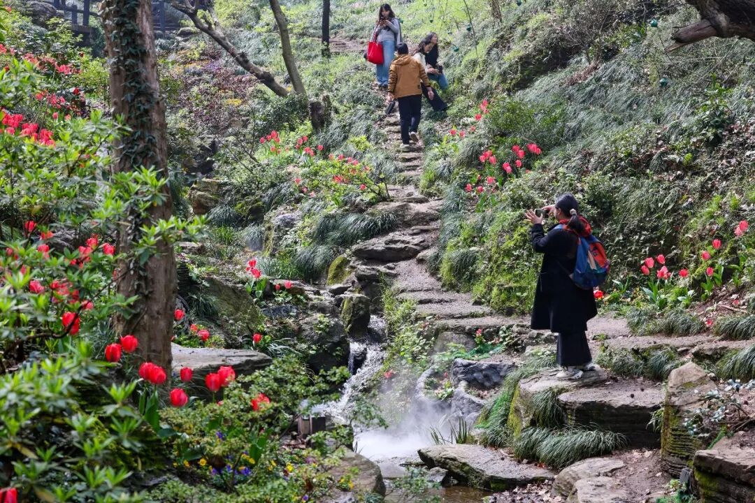 3月27日,游客在永泉小镇景区爬山赏美景。