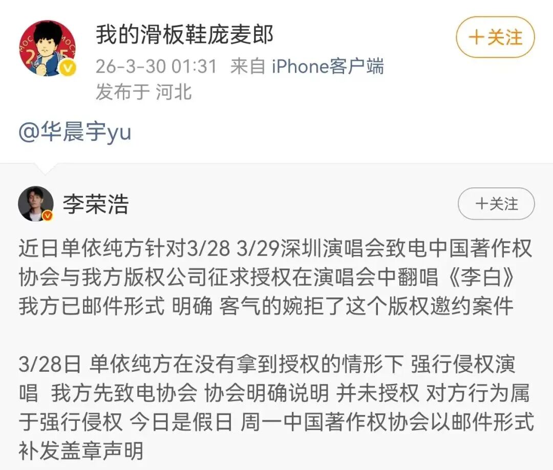 今天(30日),有媒体报道歌手庞麦郎转发了李荣浩斥责单依纯方侵权演唱《李白》的微博,并@了歌手华晨宇。