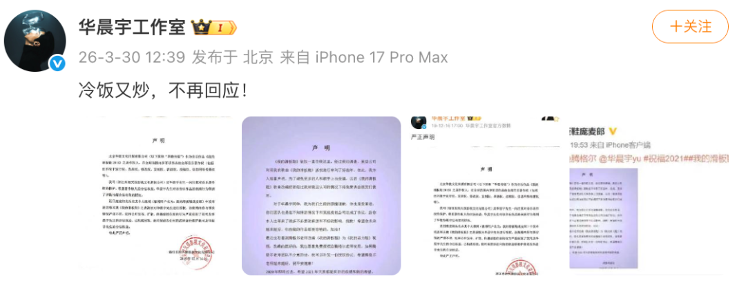 今天中午,华晨宇工作室晒出2019年的声明图,并配文,“冷饭又炒,不再回应!”