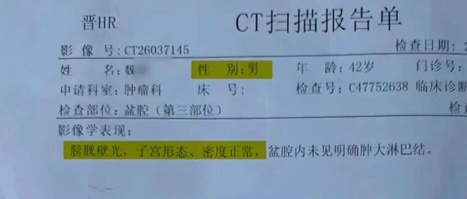 3月29日,网传山西长治医学院附属和平医院CT报告单出现书写错误,一位网友发文称,丈夫在该院的CT报告单显示“魏某,男,子宫形态正常”,引发社会关注。对此,医院成立了工作专班对事件进行核实。