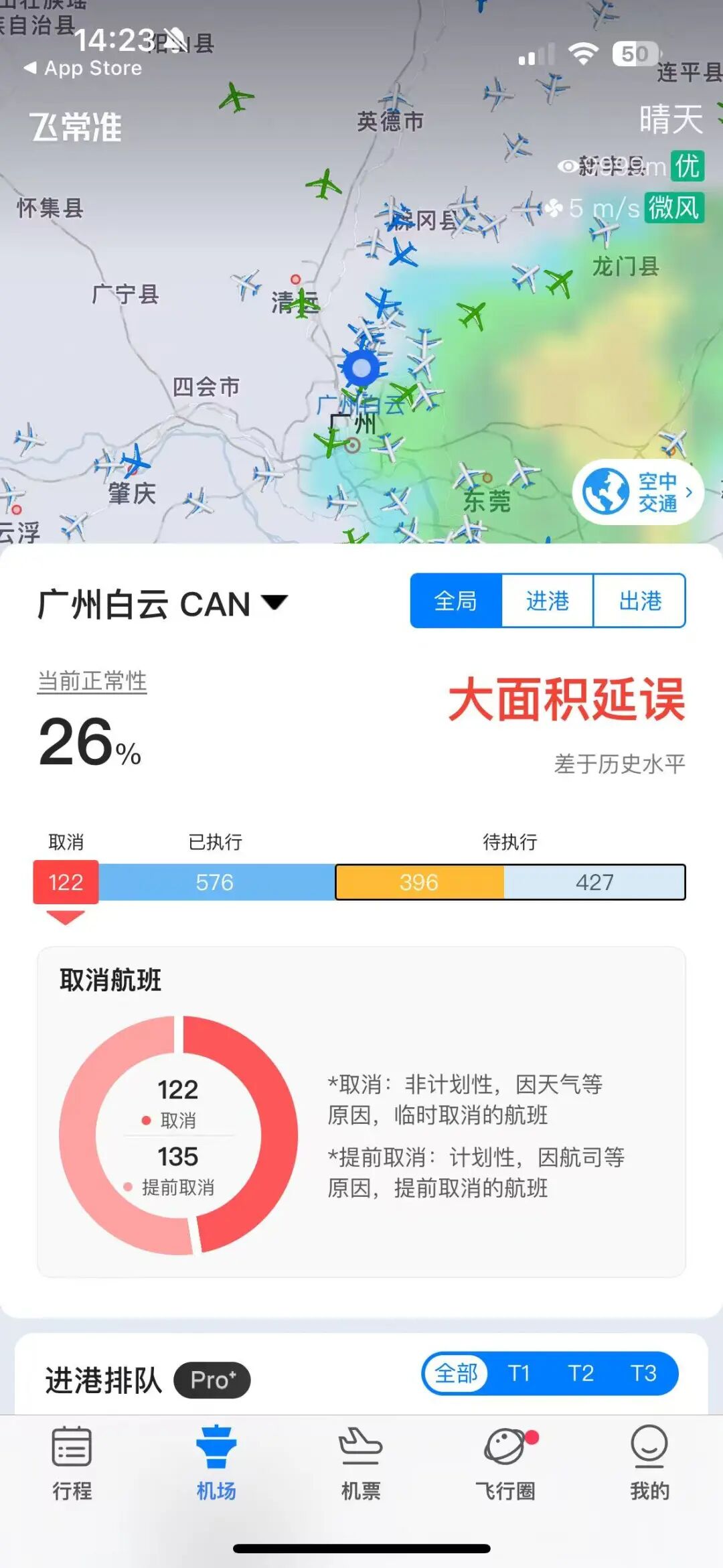 飞常准数据显示,今天,广州白云机场大面积延误。