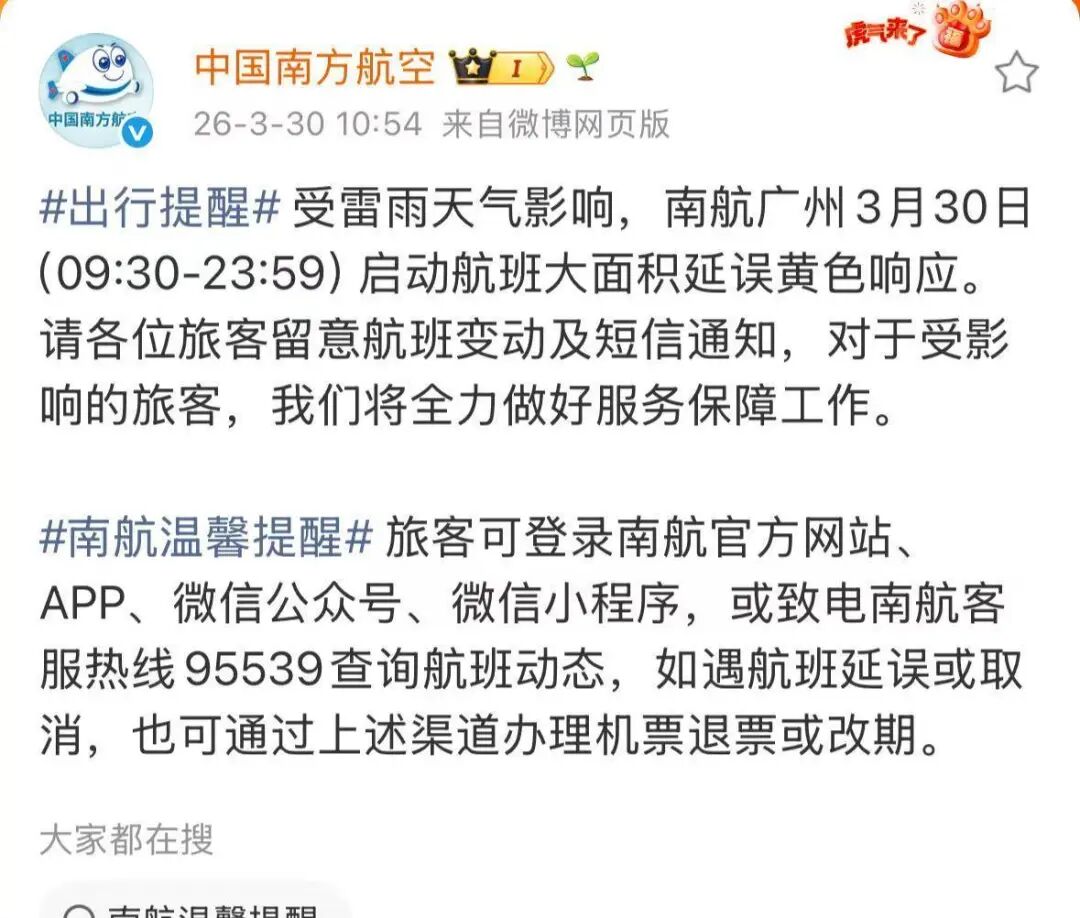 受雷雨天气影响,南航广州3月30日(09:30-23:59)启动航班大面积延误黄色响应。