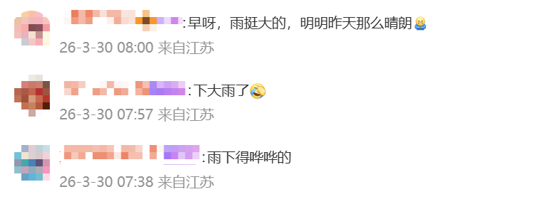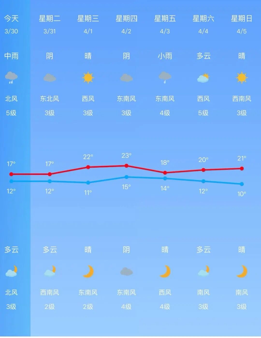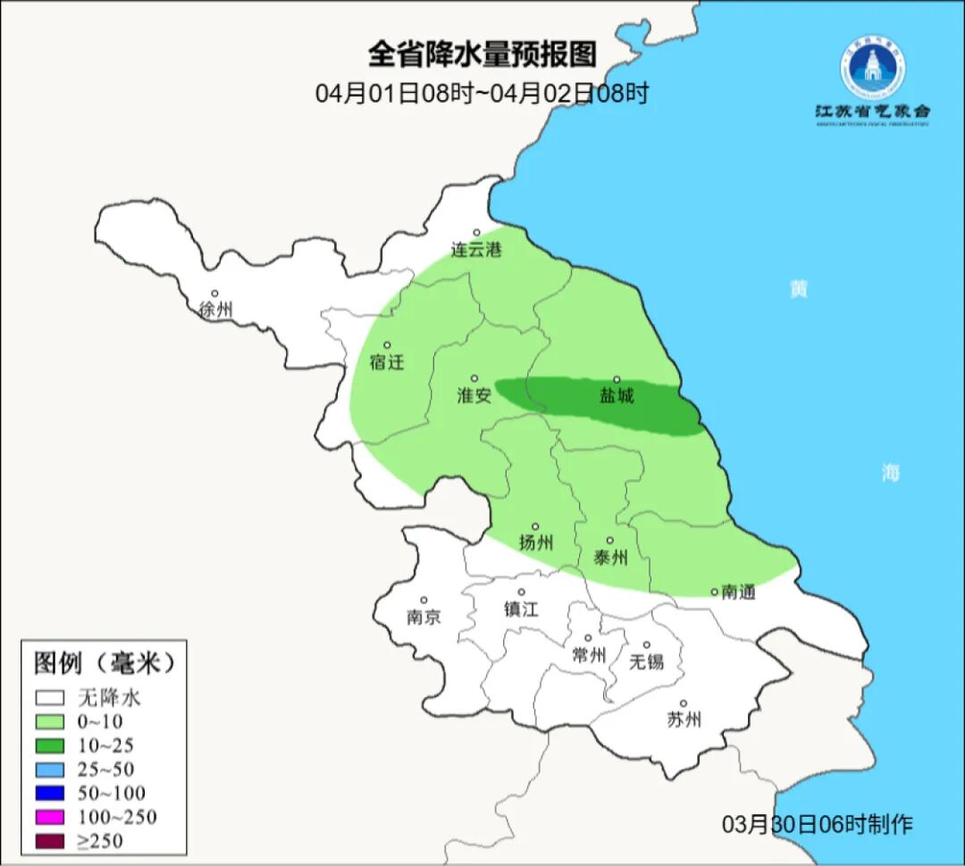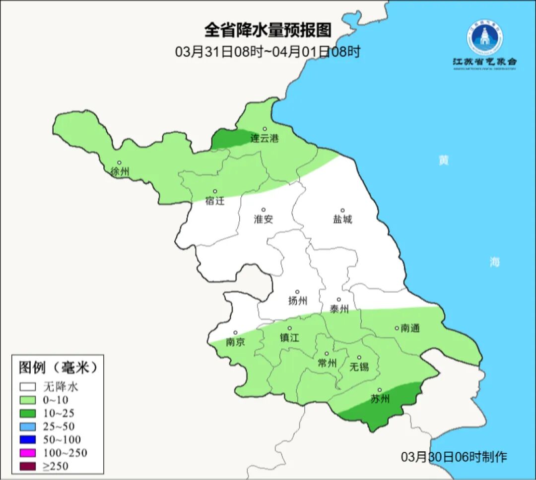 3月29日20时至3月30日20时, 沿江和苏南地区阴有阵雨或雷雨,雨量中到大,其他地区阴有小到中雨。最高温度:长江以北的东部地区16℃左右,其他地区18~19℃。最低温度:沿淮和淮北地区10~11℃,其他地区13~14℃。 全省偏东风4-5级阵风6级转偏北风5-6级阵风7级。