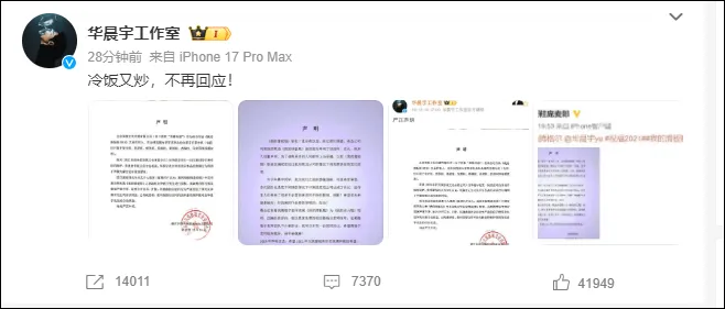 刚刚,华晨宇工作室官方发文回应称:“冷饭又炒,不再回应!”