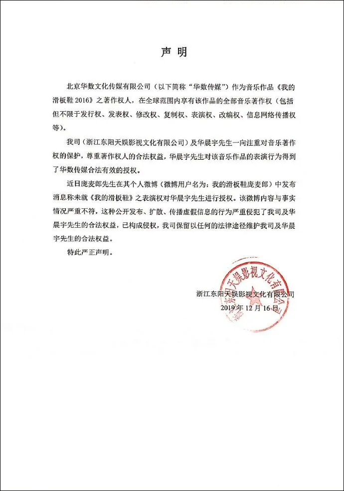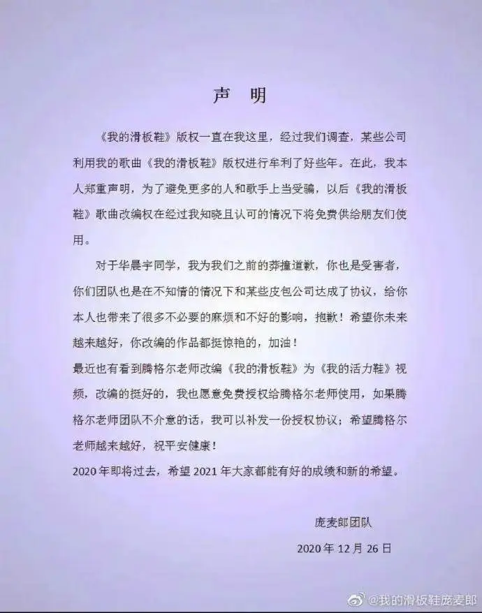 针对此前的误解与指责,庞麦郎团队已于2020 年12月26日发布正式道歉声明。声明中承认《我的滑板鞋》版权归属华数传媒,表示华晨宇团队也是“受害者”和“不知情情况下与第三方公司达成协议”,并对给华晨宇带来的麻烦致以歉意,同时称赞其改编作品惊艳。