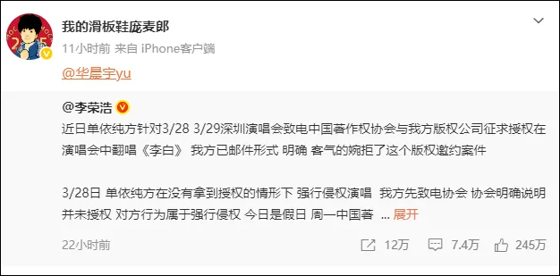 今天凌晨,庞麦郎转发了李荣浩维权的微博并艾特了华晨宇,重新引发公众对两人因《我的滑板鞋》改编版权争议的关注。随后,庞麦郎将该博文删除。
