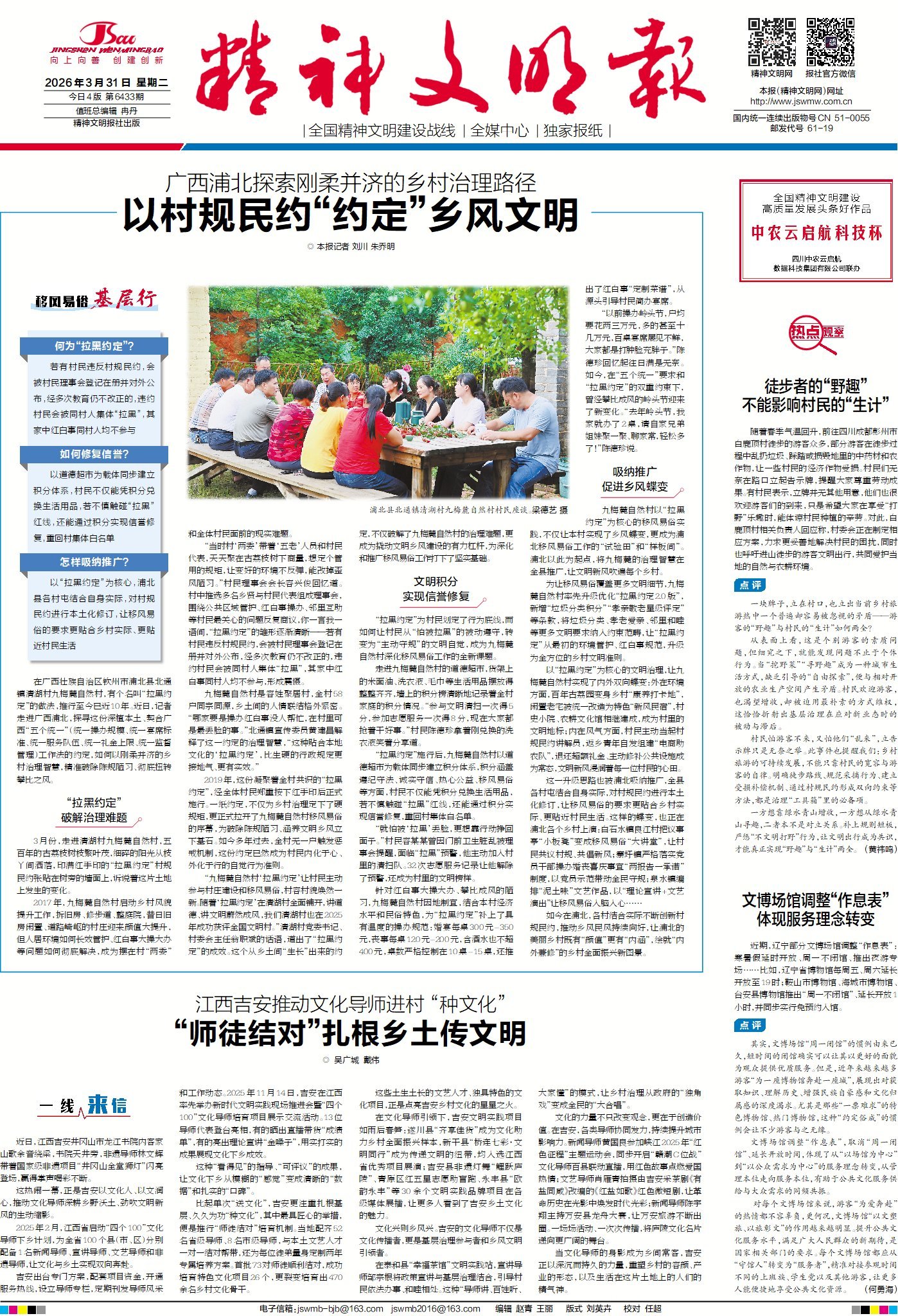 在广西钦州市浦北县北通镇清湖村九梅麓自然村,有个名叫“拉黑约定”的做法,推行至今已近10年。以“拉黑约定”为核心,浦北县各村屯结合自身实际,对村规民约进行本土化修订,让移风易俗的要求更贴合乡村实际、更贴近村民生活。请关注今日1版《移风易俗基层行》,看广西浦北如何以刚柔并济的乡村治理智慧,精准破除陈规陋习。