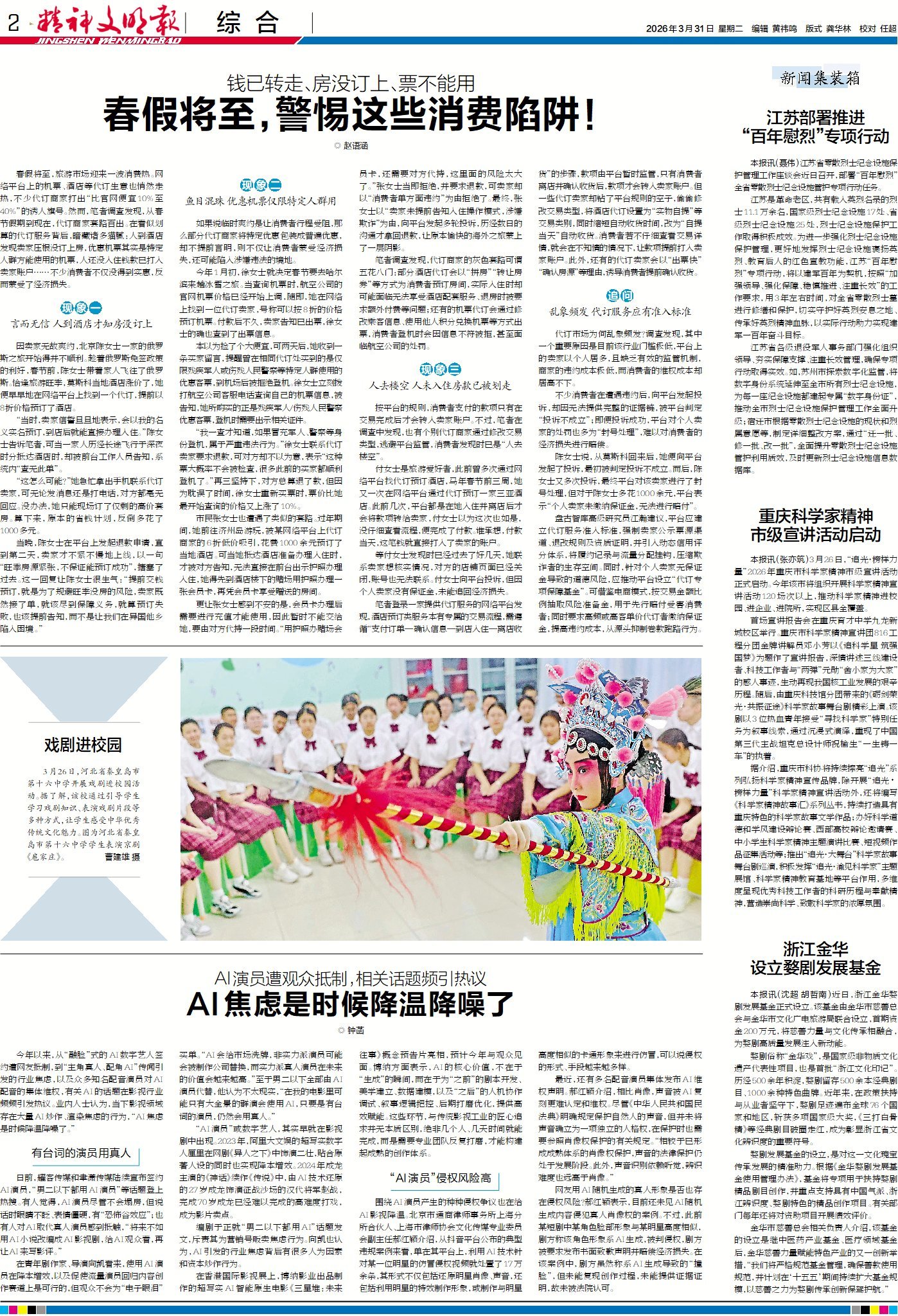 春假将至,旅游市场迎来一波消费热。网络平台上的机票、酒店等代订生意也悄然走热,不少代订商家打出“比官网便宜10%至40%”的诱人旗号。有四大现象值得警惕:言而无信,人到酒店才知房没订上;鱼目混珠,优惠机票仅限特定人群用;人去楼空,人未入住房款已被划走;乱象频发,代订服务应有准入标准。该如何预防被骗,跟孩子一起过个好春假?今日2版“综合”关注与春假出游相关的消费陷阱。