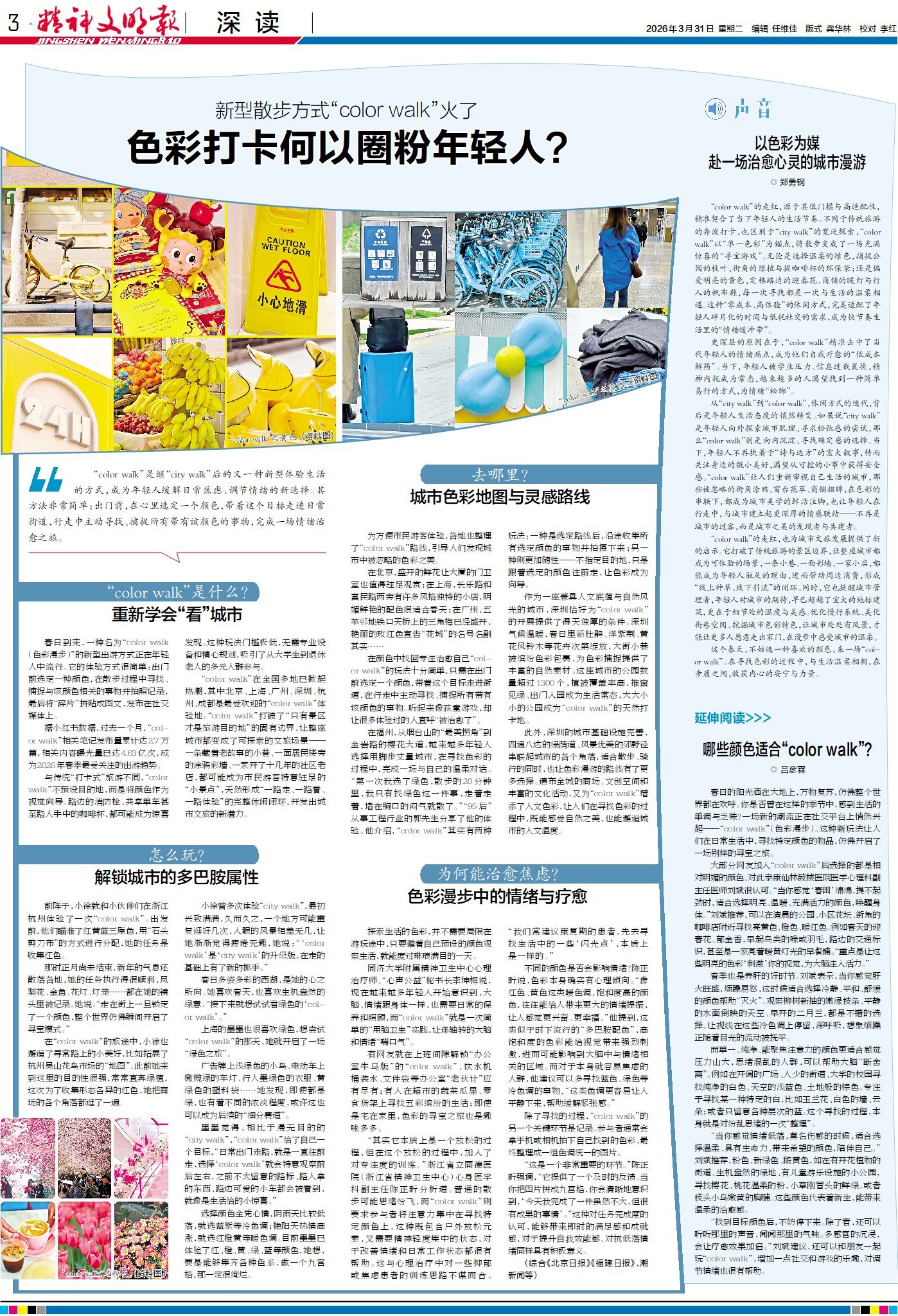 继“city walk”之后,“color walk”(色彩漫步)成为年轻人疗愈情绪的新方式。只需选定一种颜色,在行走中捕捉所有带有该色彩的事物,便能将日常街巷变为探索场域。这项低门槛活动不仅串联起城市中被忽略的风景,更在专注与收集中实现情绪放松。今日3版“深读”看详情。
