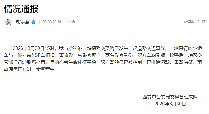 据@西安交警 通报 :2026年3月30日15时,我市拾翠路与麟德路交叉路口发生一起道路交通事故。一辆直行的小轿车与一辆左转出租车相撞,事故致一名乘客死亡,两名乘客受伤,双方车辆受损。接警后,辖区交管部门迅速到场处置。目前伤者生命体征平稳,双方驾驶员已被控制,已排除酒驾、毒驾嫌疑,事故原因正在进一步调查中。
