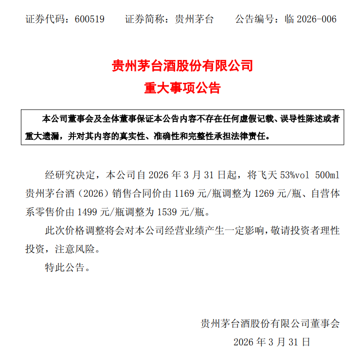 贵州茅台(600519.SH)发布公告称,自2026年3月31日起,飞天53%vol 500ml贵州茅台酒(2026)销售合同价由1169元/瓶调整为1269元/瓶,自营体系零售价由1499元/瓶调整为1539元/瓶。
