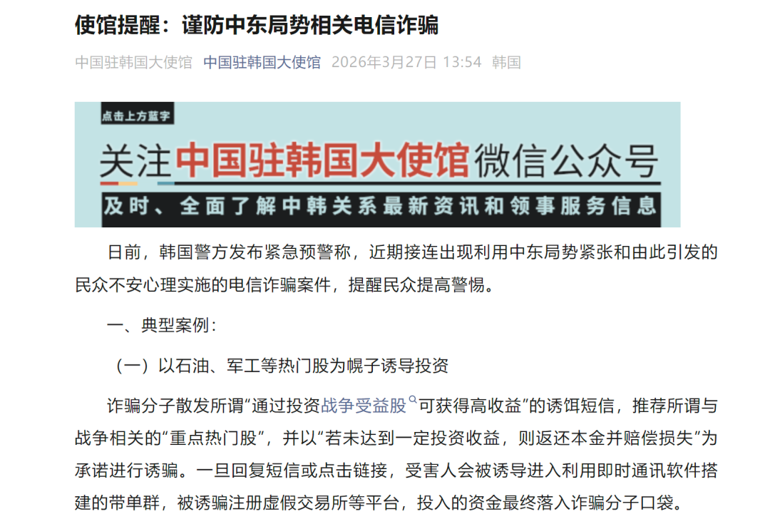提醒在韩中国公民谨防中东局势相关电信诈骗 日前,韩国警方发布紧急预警称,近期接连出现利用中东局势紧张和由此引发的民众不安心理实施的电信诈骗案件,提醒民众提高警惕。(详情请戳↓↓↓)