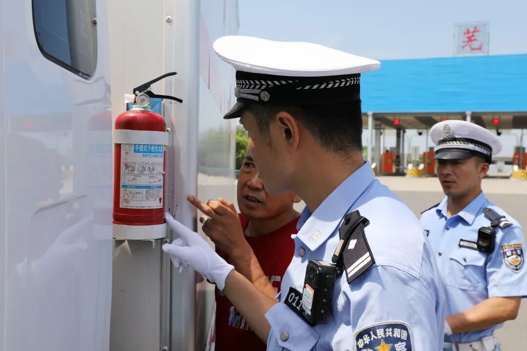 民警检查一辆运输烟花爆竹货车车载灭火器
