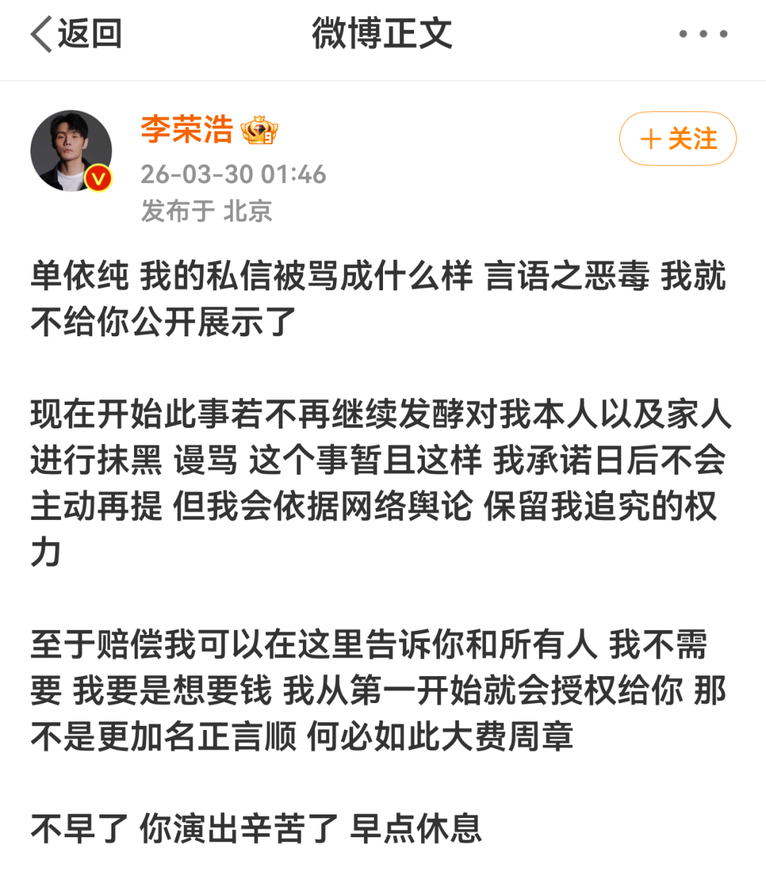 现在开始此事若不再继续发酵对我本人以及家人进行抹黑、谩骂,这个事暂且这样,我承诺日后不会主动再提,但我会依据网络舆论,保留我追究的权力。