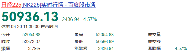 30日,日韩股市大幅低开,日经225指数一度跌超5%,截至午间休市,报50936.13点。