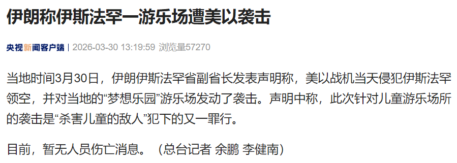 当地时间3月30日,伊朗伊斯法罕省副省长发表声明称,美以战机当天侵犯伊斯法罕领空,并对当地的“梦想乐园”游乐场发动了袭击。声明中称,此次针对儿童游乐场所的袭击是“杀害儿童的敌人”犯下的又一罪行。