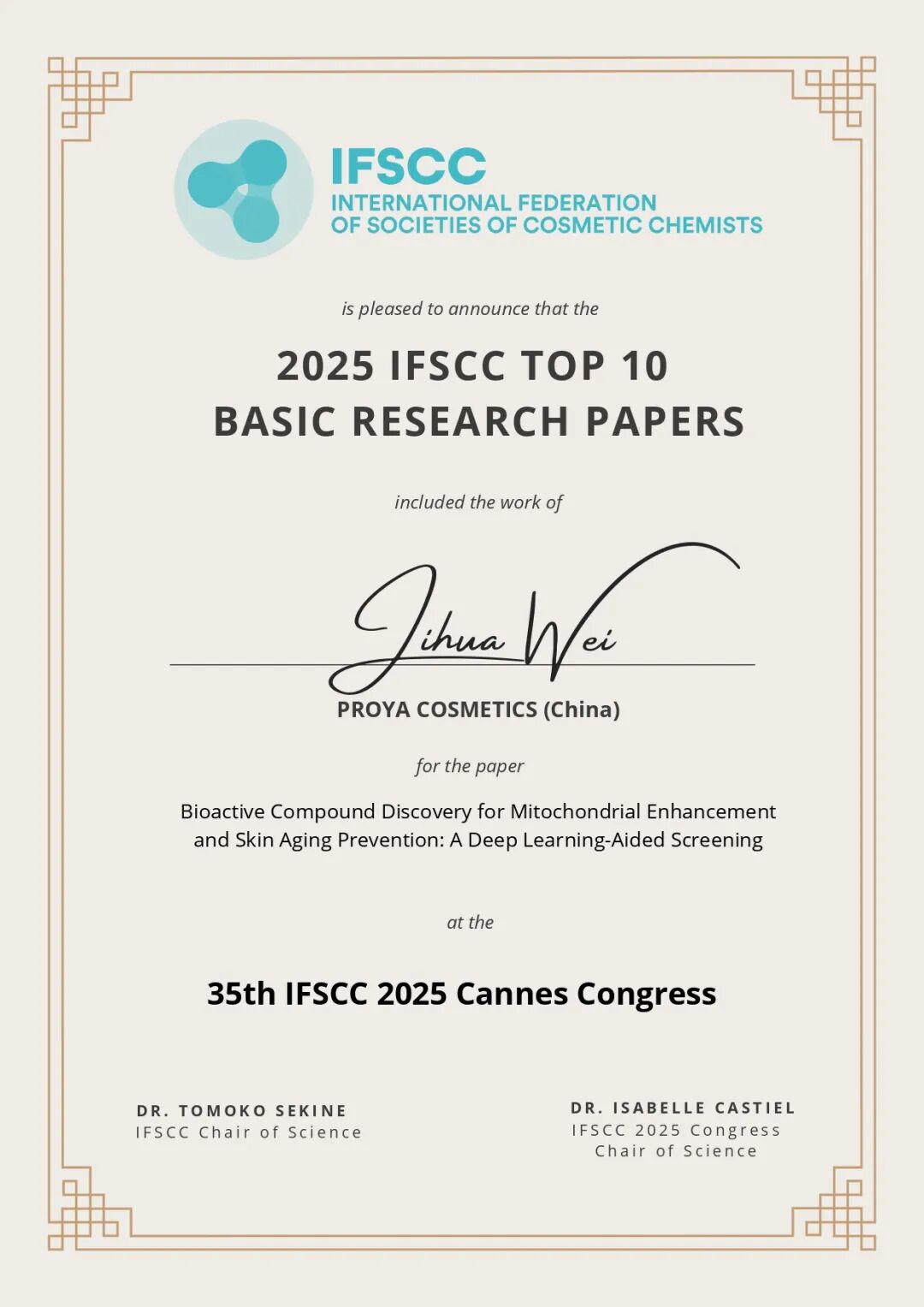 珀莱雅荣获“2025IFSCC十大基础研究奖”
