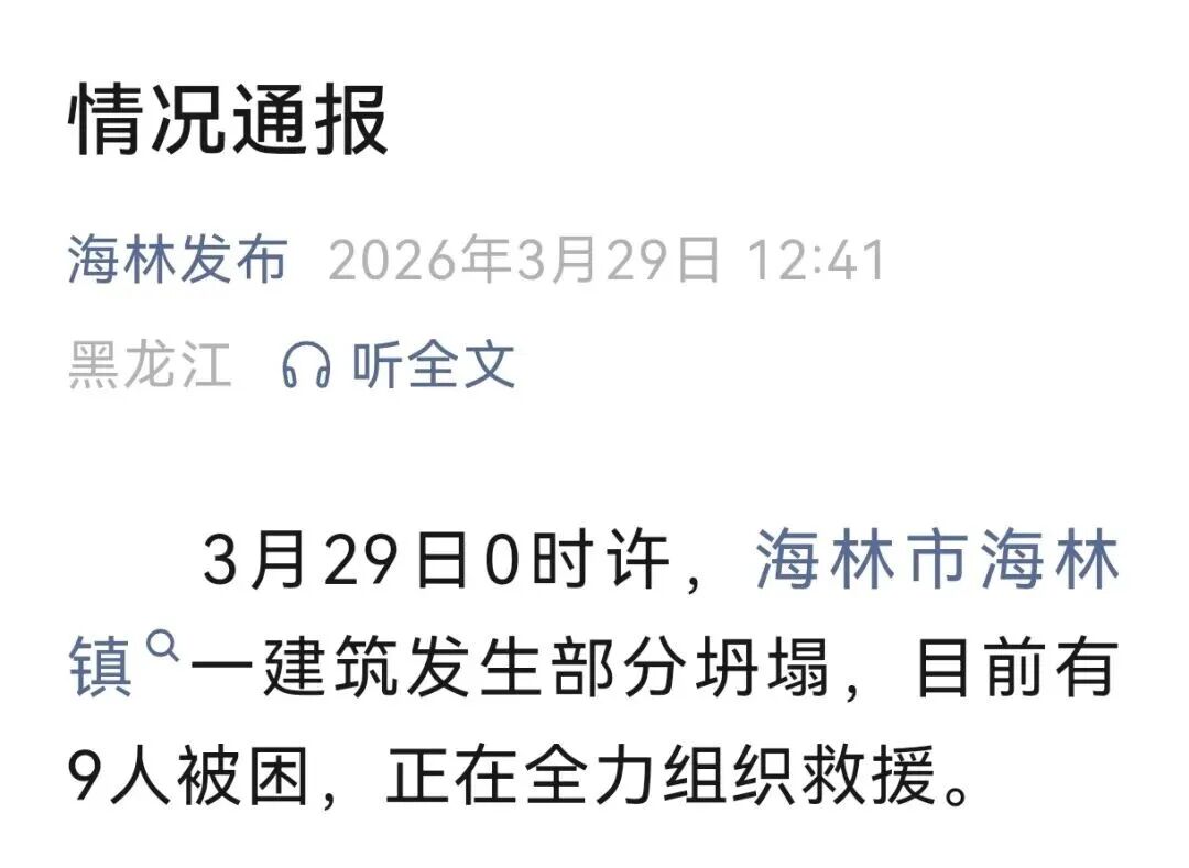 3月29日日0时许,黑龙江海林市海林镇一建筑发生部分坍塌,目前有9人被困,正在全力组织救援。