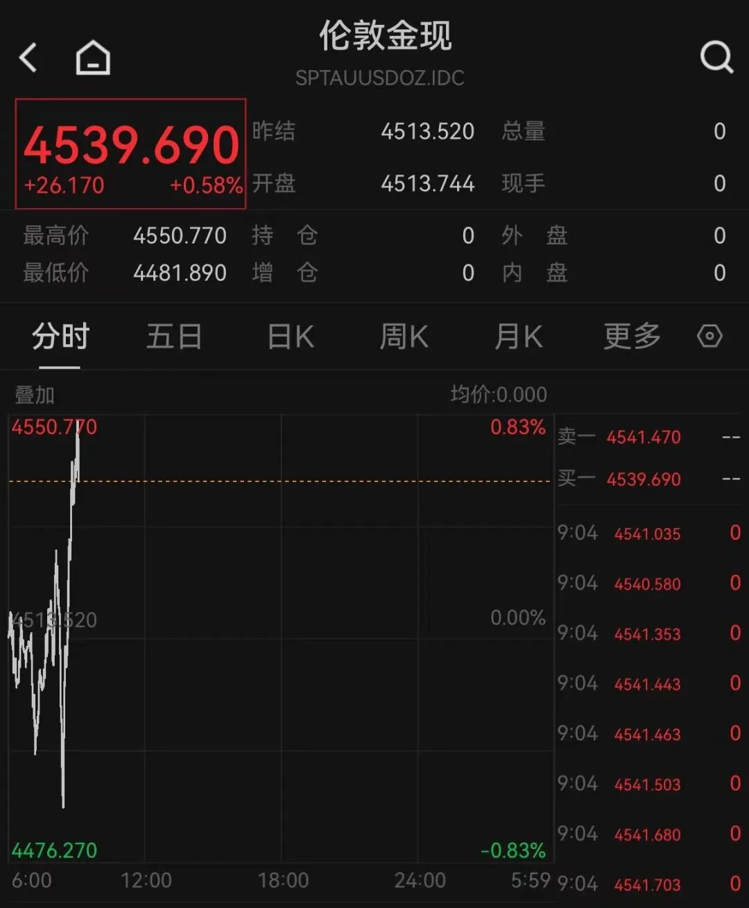 现货黄金向上触及4550美元/盎司,日内涨0.58%。