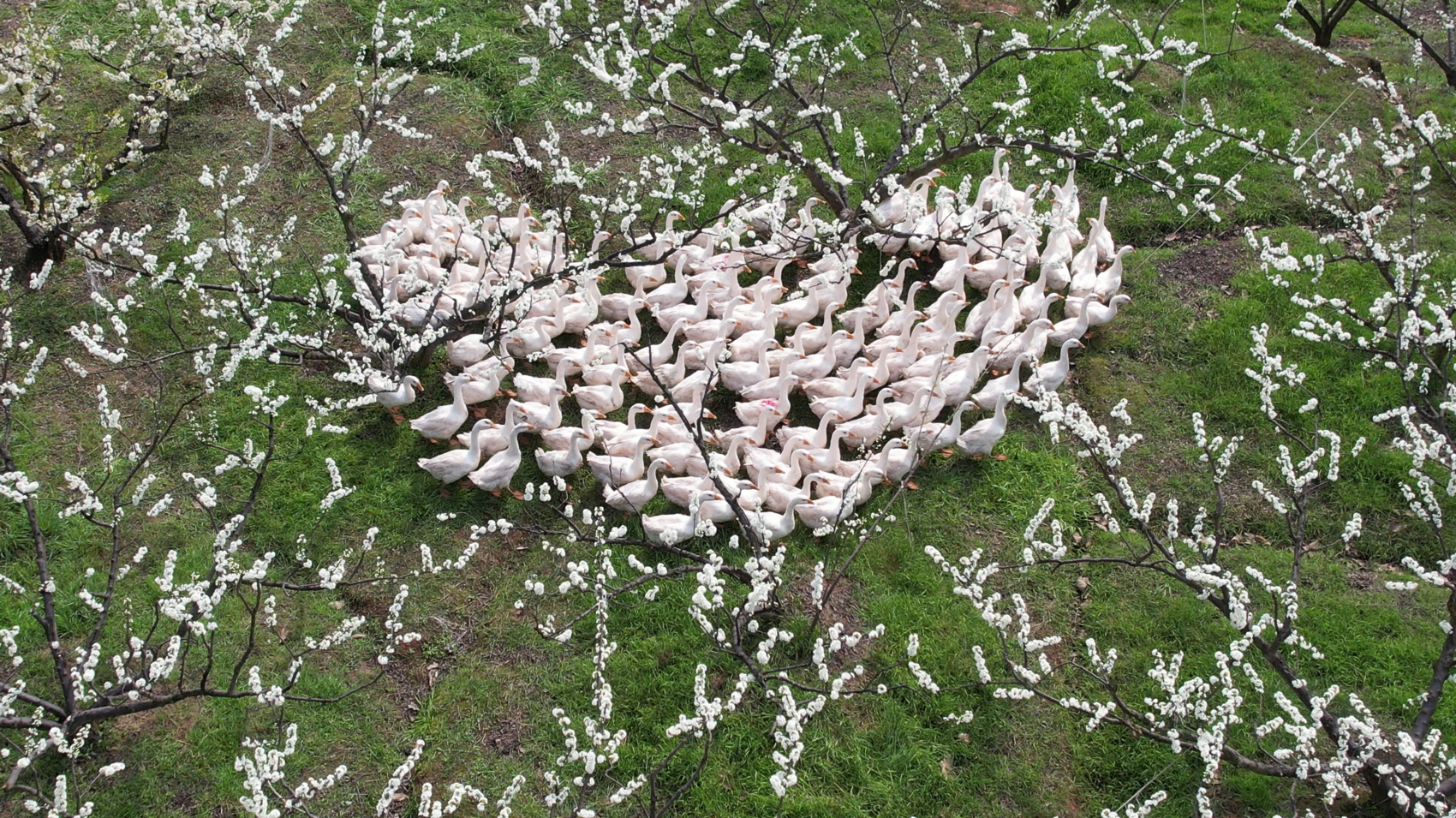这些天,宜宾市屏山县李花文化旅游活动正热闹展开。络绎不绝的游客穿行花海之余,还惊喜地发现,花影深处有一群“白影”相伴——茵红李树下,一只只大白鹅正悠闲踱步,憨态可掬的模样引得不少游客举起相机。