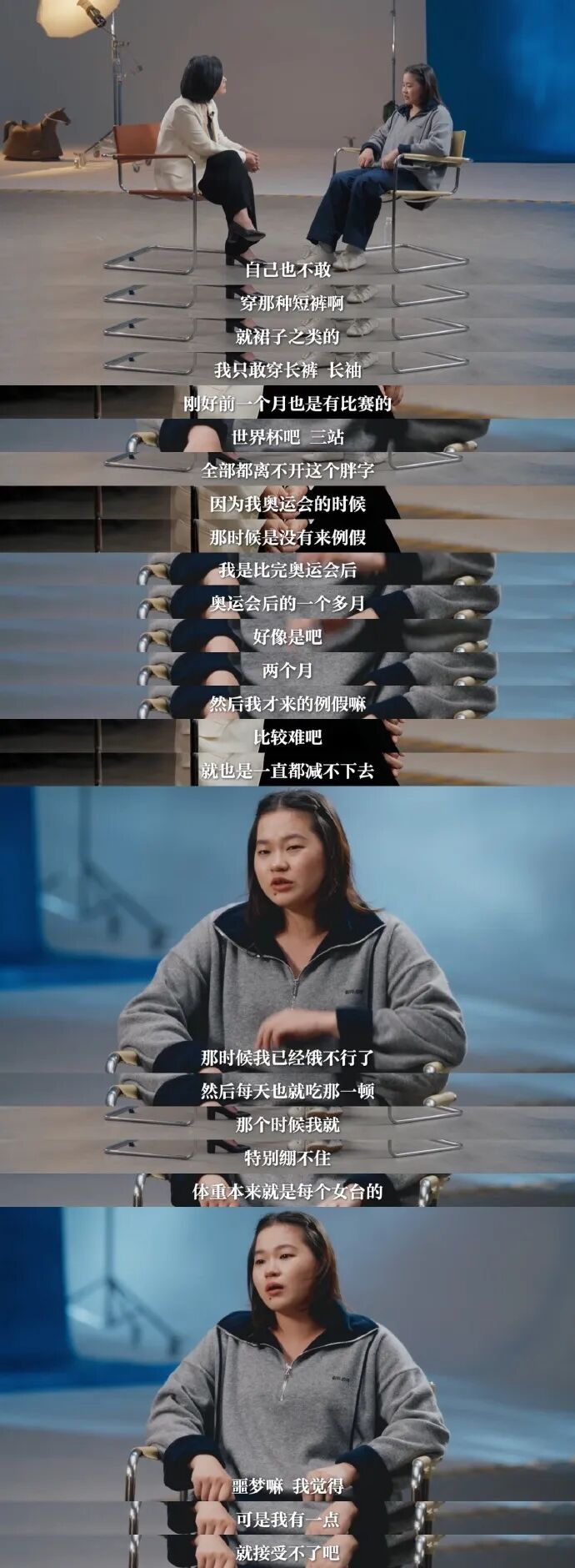 她表示第一次来例假,吃一点体重就会长,那时候每天都能看到有人说她胖,“但我已经要饿爆了,减肥减到我感觉我都快‘嘎’了。”她特别伤心,到后来,已经有心理阴影,看到体重秤就特别害怕,直言“每天就吃那一顿饿得不行,接受不了这么胖的自己”。这种压力甚至影响训练状态,站上跳台时“曾经不害怕的动作都很害怕”。