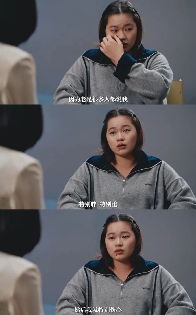 “别人老说我的体重特别重,我看到体重秤就特别害怕。老是很多人都说我特别胖、特别重,我就特别伤心。”
