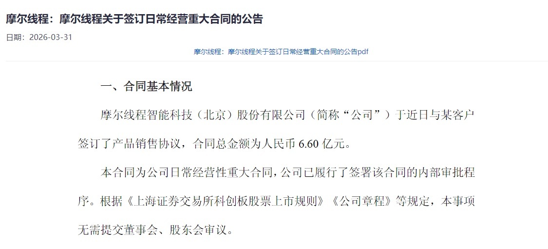 3月30日晚间,摩尔线程披露重大合同公告称,公司于近日与某客户签订了产品销售协议,合同标的为摩尔线程夸娥(KUAE)智算集群,合同总价款为6.6亿元。若本合同顺利履行,预计将对公司的经营业绩产生积极影响,公司将根据合同的相关规定以及公司收入确认原则,在相应的会计期间确认收入。