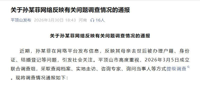 近期,孙某菲在网络平台发布信息,反映其母亲去世后被办理户籍、身份证、结婚登记等问题,引发社会关注。平顶山市高度重视,2026年3月5日成立联合调查组,采取查阅档案、实地走访、咨询专家、询问当事人等方式提级调查。现将调查情况通报如下:
