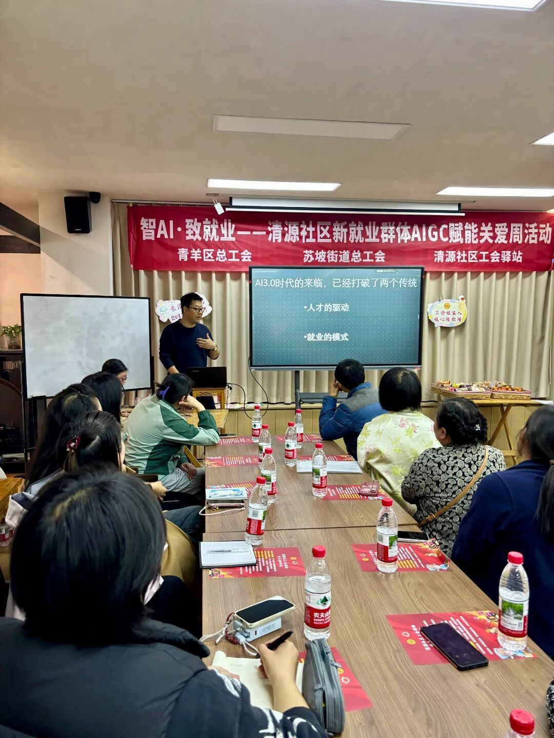“用AI规划配送路线,试试这个指令……”近日,在成都市青羊区清源社区工会驿站,来自青羊区大学生创业(AIGC)孵化部的刘纯正对着满屋学员讲解。台下,约40名来自快递、外卖、家政等行业的新就业群体学员,紧盯屏幕,跟着操作。这场由青羊区、苏坡街道两级总工会组织的“智AI·致就业”培训,目标直白——让普通劳动者,也能用上AI。