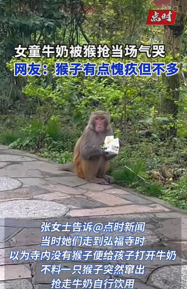 张女士告诉记者,当时她们走到弘福寺时,以为寺内没有猴子便给孩子打开牛奶,不料一只猴子突然窜出抢走牛奶自行饮用,女儿当场被气哭。她第一时间安抚女儿并检查是否被抓伤,确认无碍后拍下视频,觉得画面有趣便分享出来。不少网友调侃,猴子看到孩子哭后,表情似乎有点愧疚,但不多。