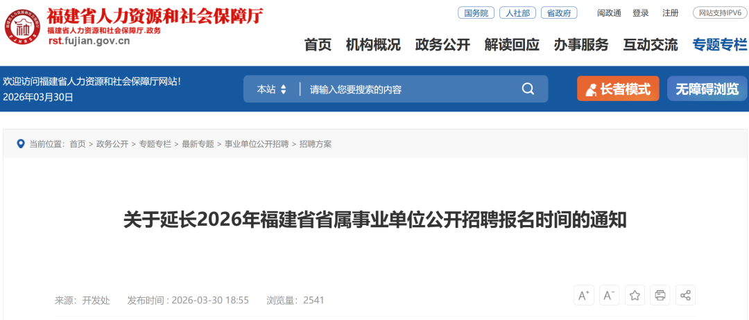 2026年福建省省属事业单位公开招聘报名时间延长