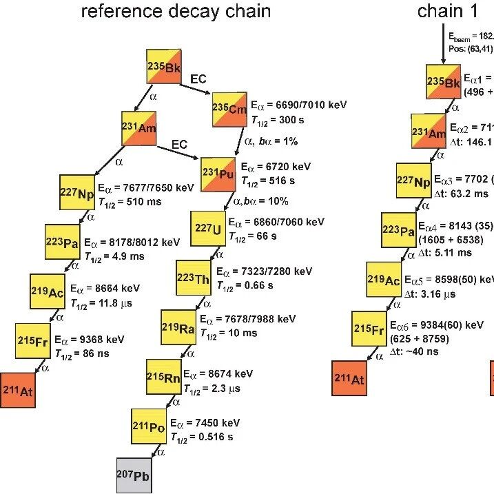 基于单原子核灵敏的探测鉴别技术,团队观测到三条具有能量—位置—时间关联的阿尔法衰变链,首次测量了锫-235和镅-231的阿尔法衰变粒子能量分别为7632 keV和7109 keV,并测量了镅-231的半衰期为75秒、阿尔法衰变分支比为17%。这些研究结果进一步拓展了缺中子锫和镅同位素的阿尔法衰变系统性。
