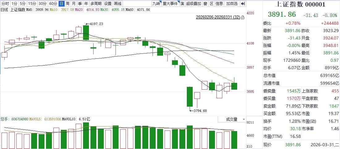 3月31日A股市场三大股指集体杀跌,上证指数再次击穿3900点整数关口。